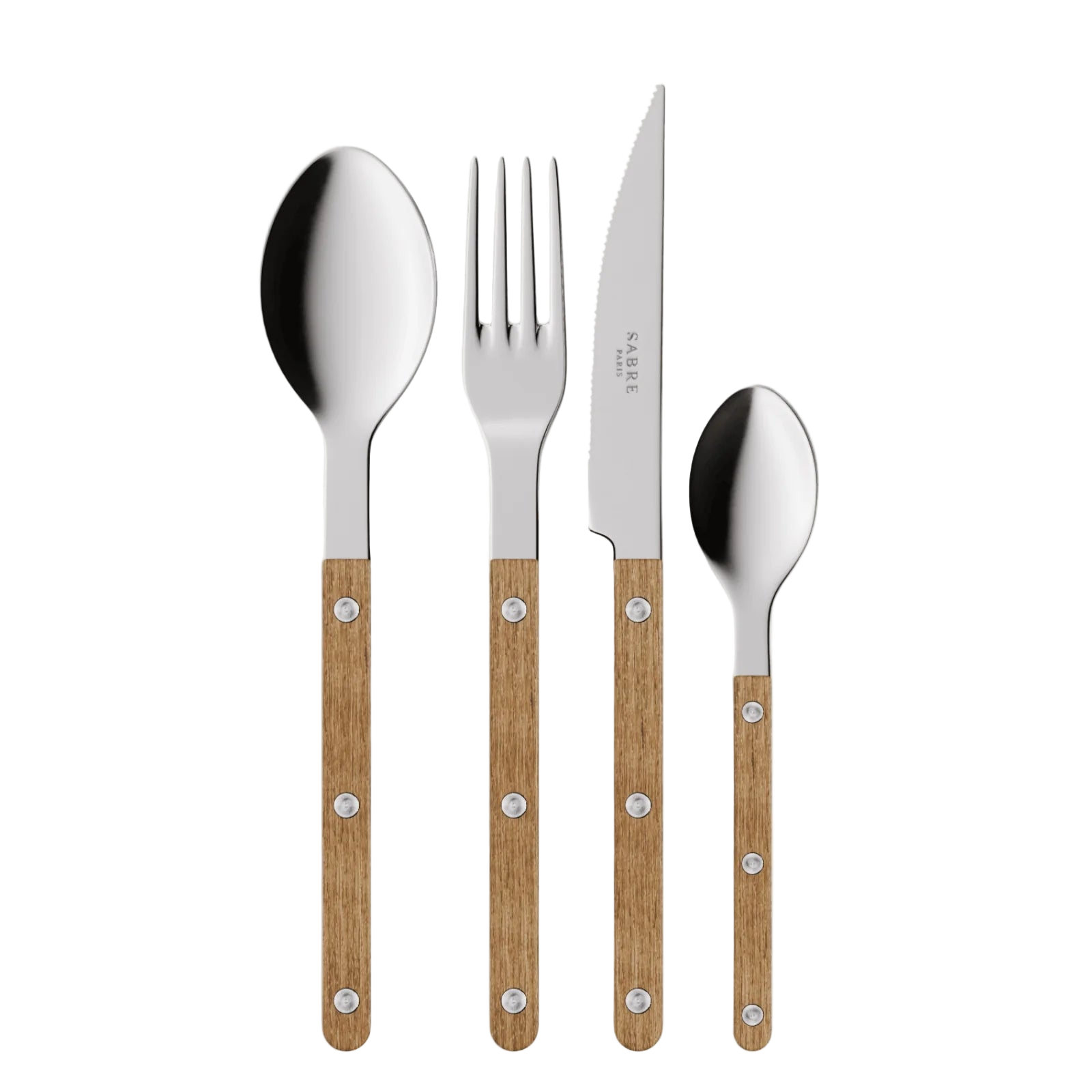 The 4-piece sets are comprised of a soup spoon, a dinner fork, a dinner knife and a teaspoon. The 5-piece set includes a soup spoon, a dinner fork, a dinner knife, a teaspoon and a salad fork.