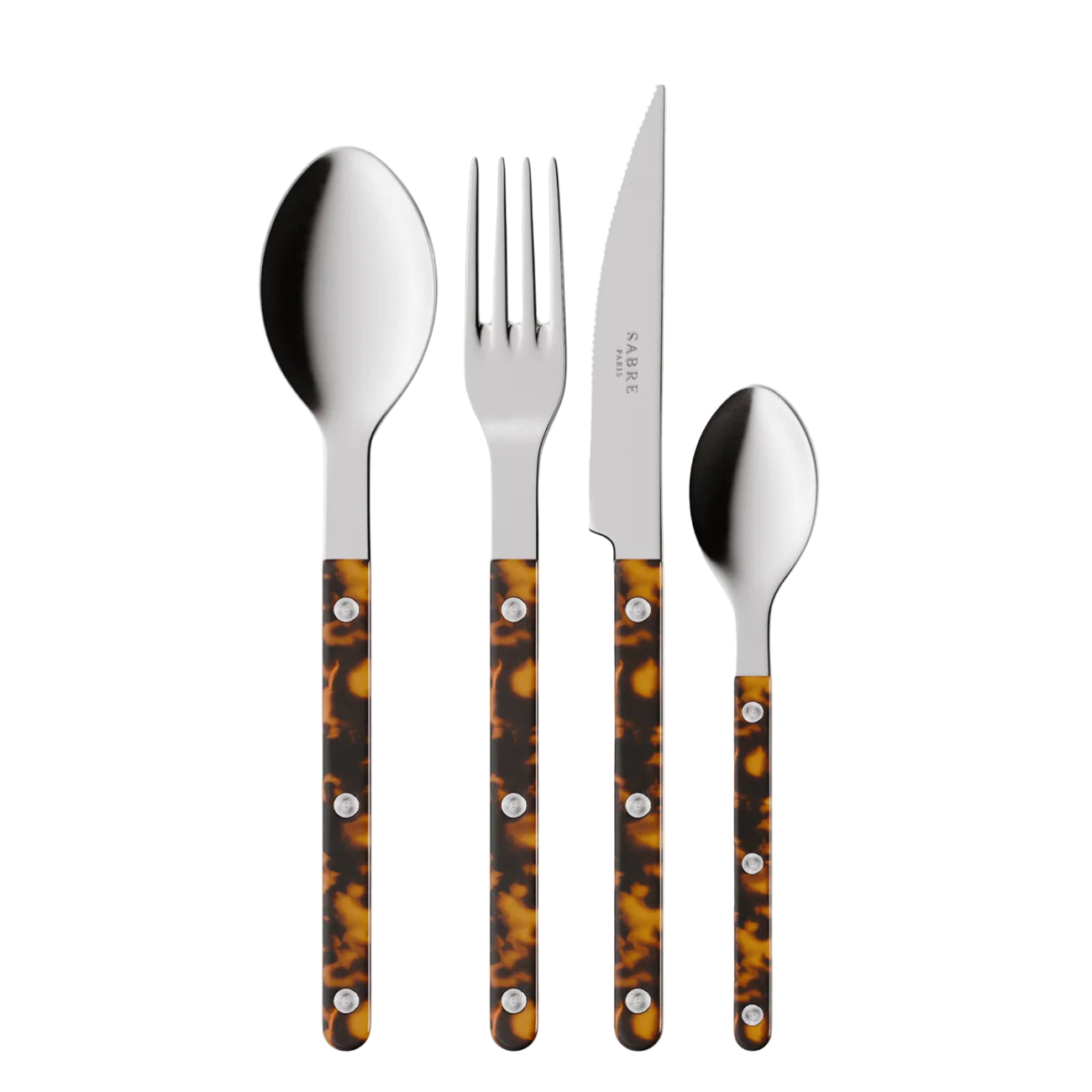 The 4-piece sets are comprised of a soup spoon, a dinner fork, a dinner knife and a teaspoon. The 5-piece set includes a soup spoon, a dinner fork, a dinner knife, a teaspoon and a salad fork.