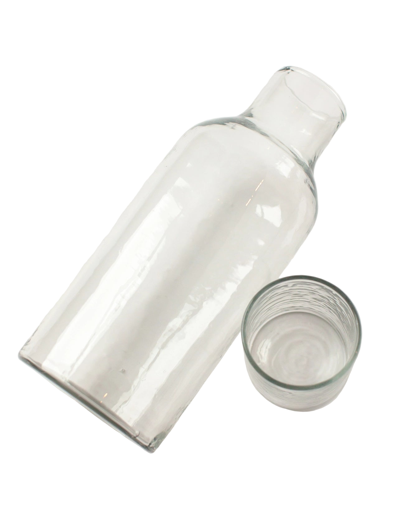 Form meets function in these stunning glass carafes. Each is handblown from recycled glass then meticulously hammered by hand for a truly unique finish. The set includes a carafe and lid that doubles as a small drinking glass.