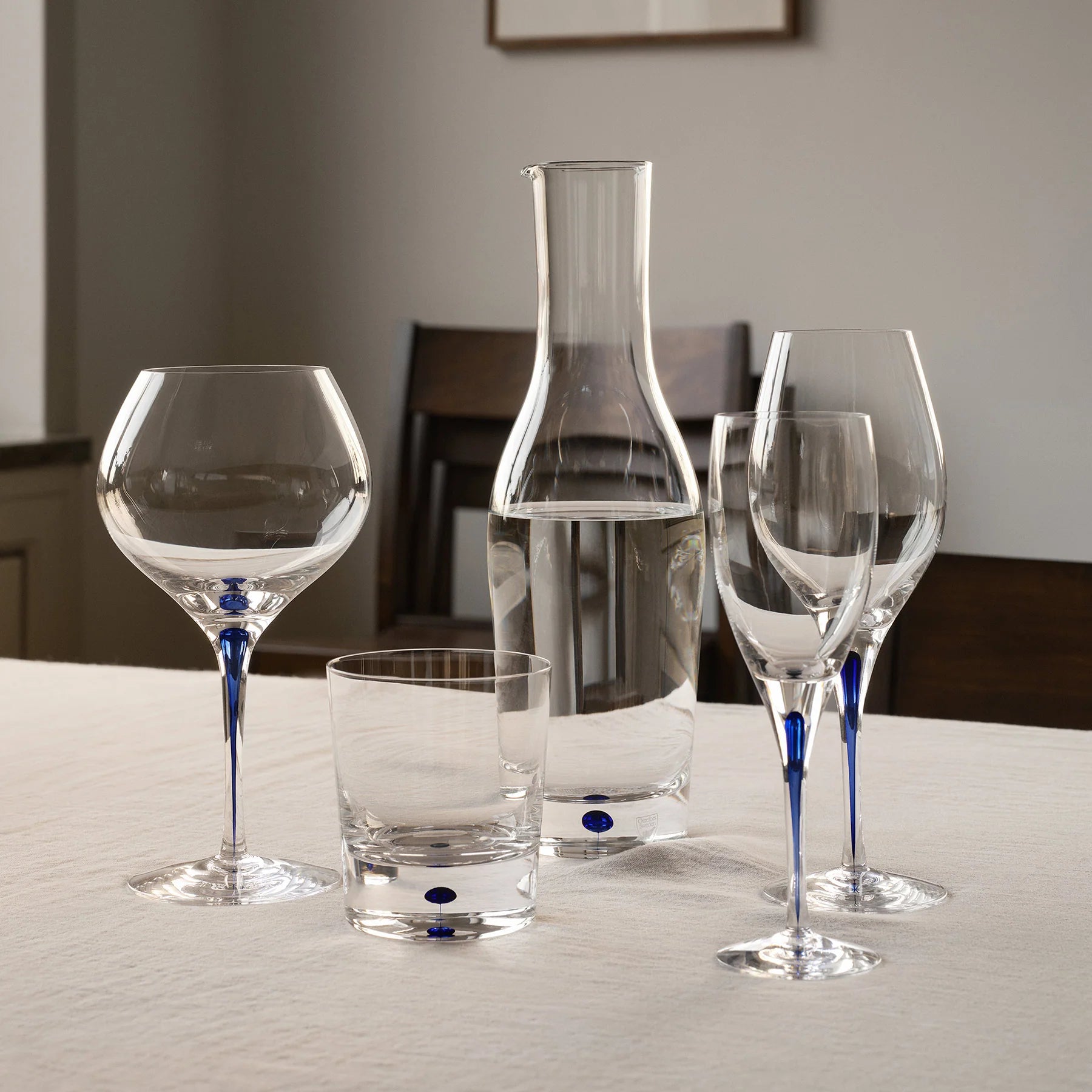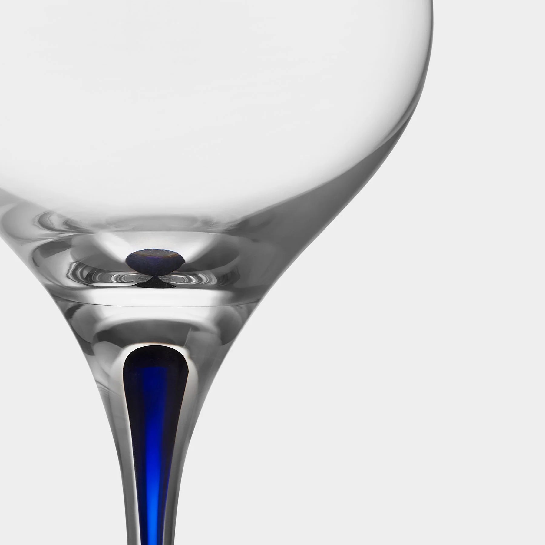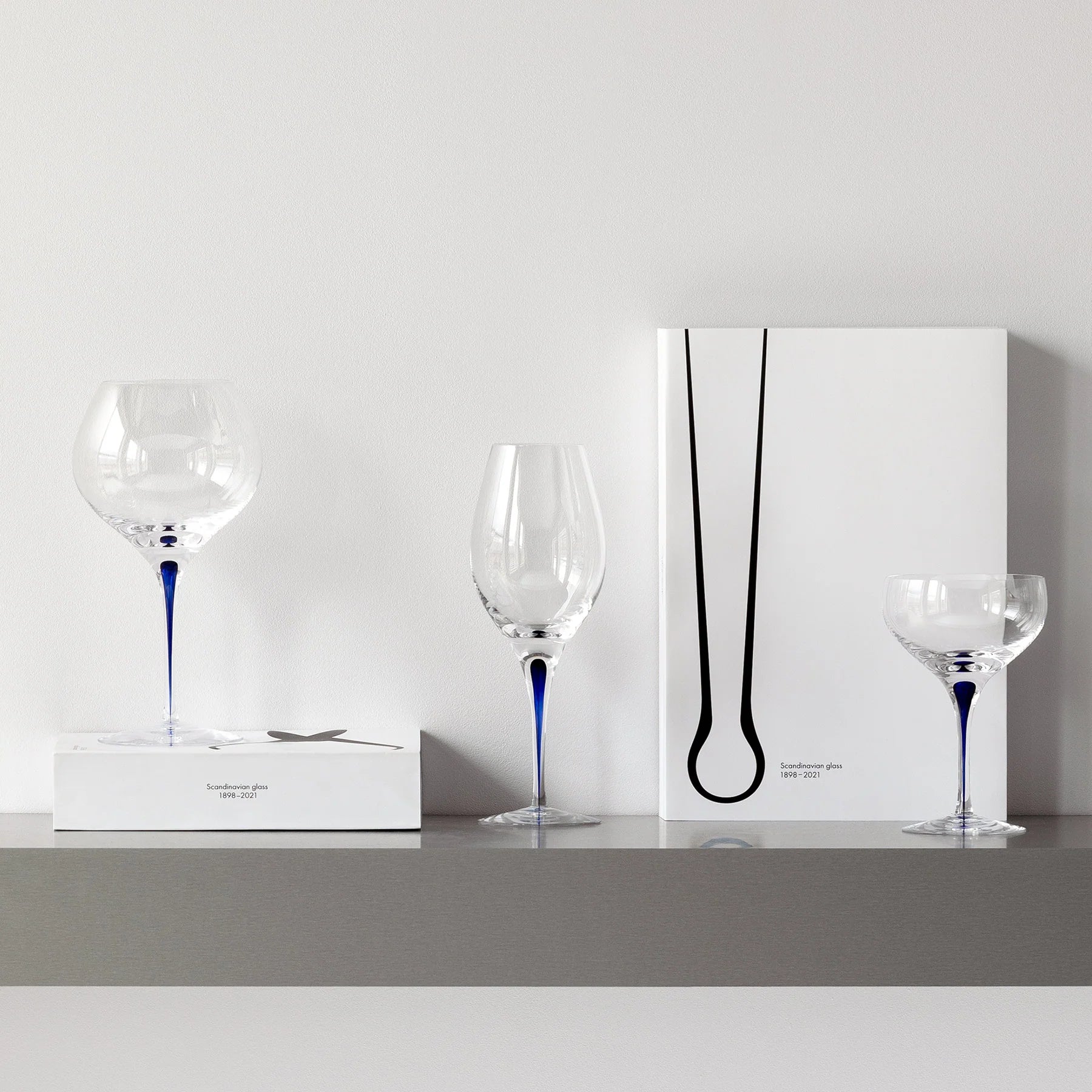 Intermezzo Aroma from Orrefors was designed in 1984. The glass holds 20 oz and is outstanding for all red wines with fresh, fruity flavors, regardless of grape. The large bowl allows the aromas of the wine to develop. Intermezzo Aroma is mouth-blown in Sweden by expert glassblowers and has a drop of blue sealed inside the stem – an innovation based on traditional craftsmanship. Designed by Erika Lagerbielke.