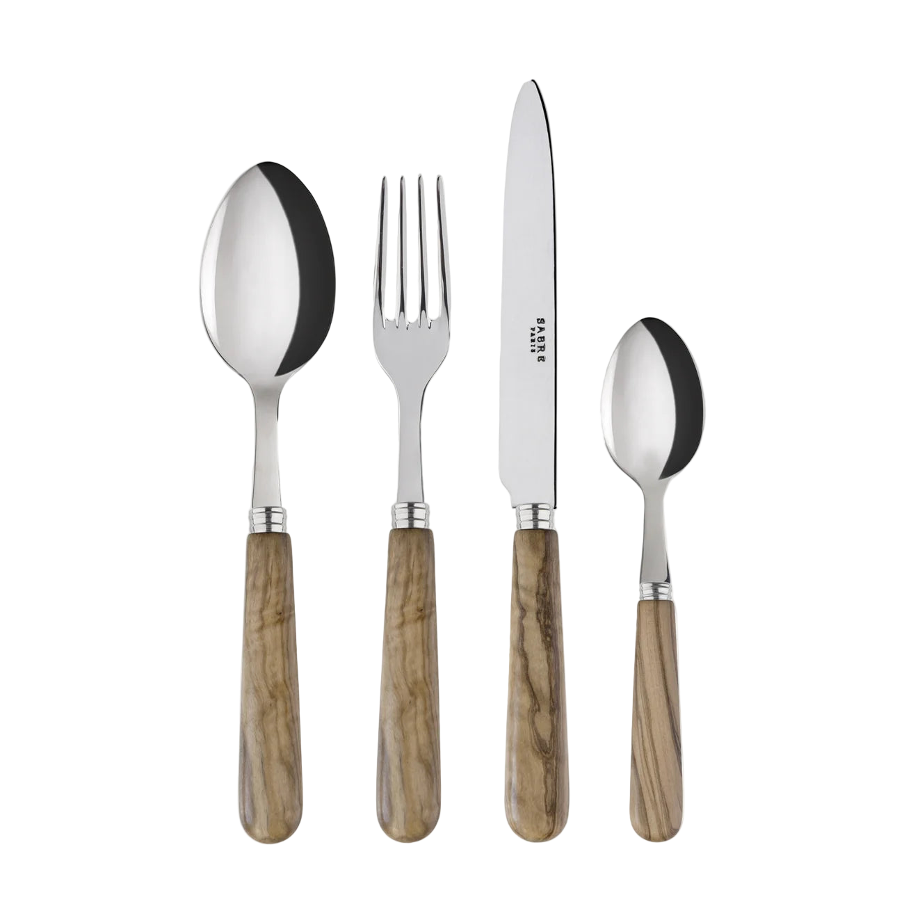 The 4-piece sets are comprised of a soup spoon, a dinner fork, a dinner knife and a teaspoon. The 5-piece set includes a soup spoon, a dinner fork, a dinner knife, a teaspoon and a salad fork.