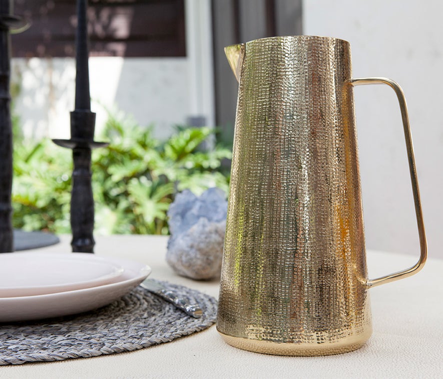 The tall, sleek shape of the Miles Pitcher is softened by the hammered texture of its finish. A wonderful study in form and function.